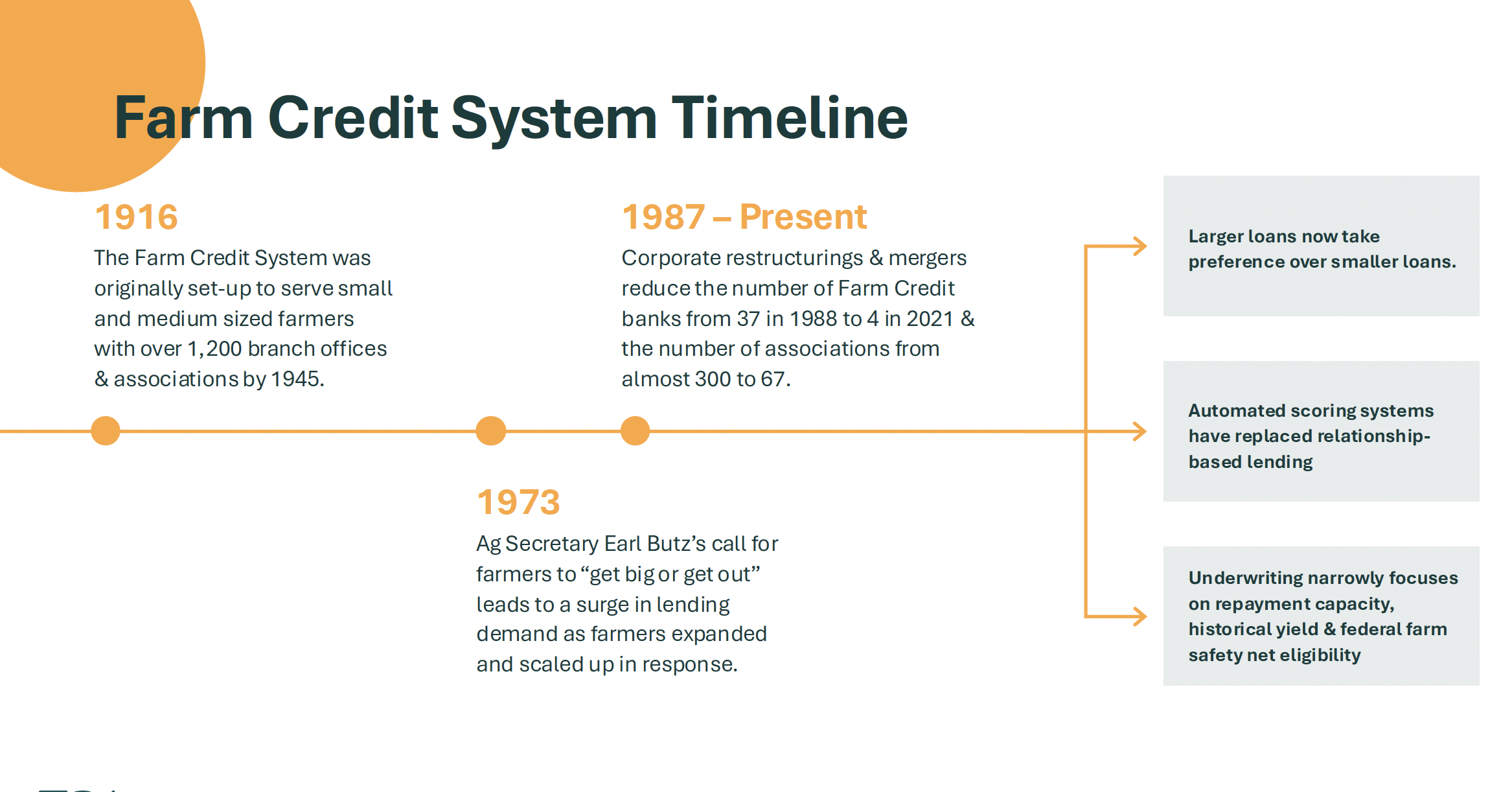 Over decades, agricultural finance shifted from local, relationship-based lending toward consolidation and standardized risk models. These changes reduced risk for conventional agriculture but made it harder for regenerative producers — who lack conventional safety net supports — to access capital. The timeline below illustrates these structural shifts.